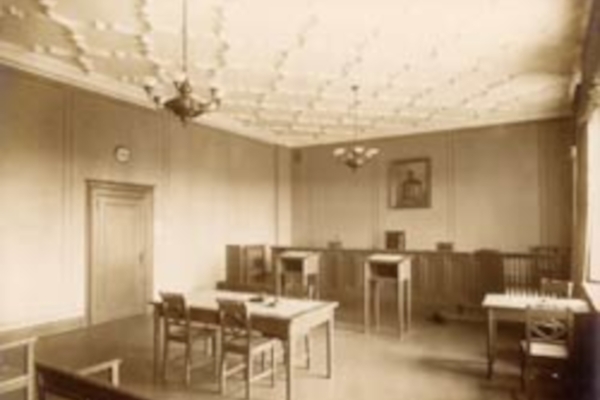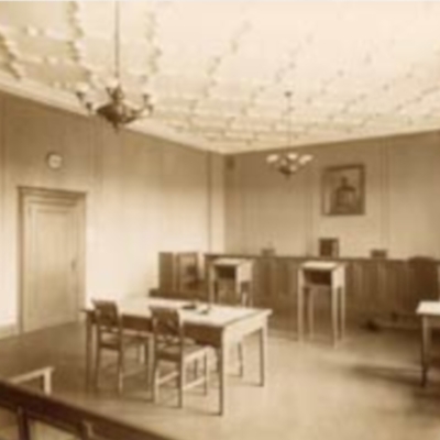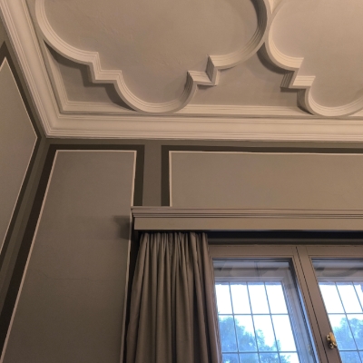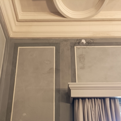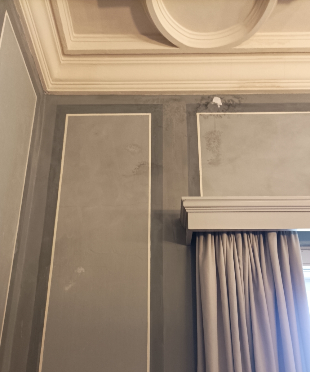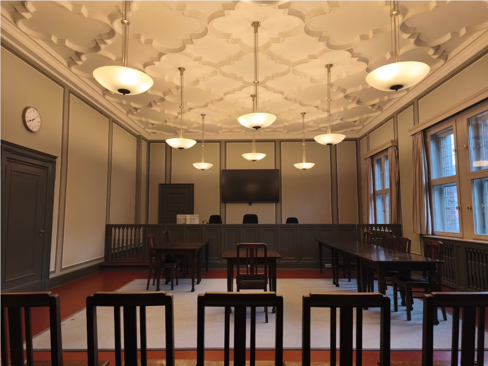 April-Juli 2025: Restaurierung Gerichtssaal 200 mit Putz- u. Malerarbeiten, Gesimsabdeckung Kupfer, Wartung und Instandhaltung Fenster des Giebelportals,