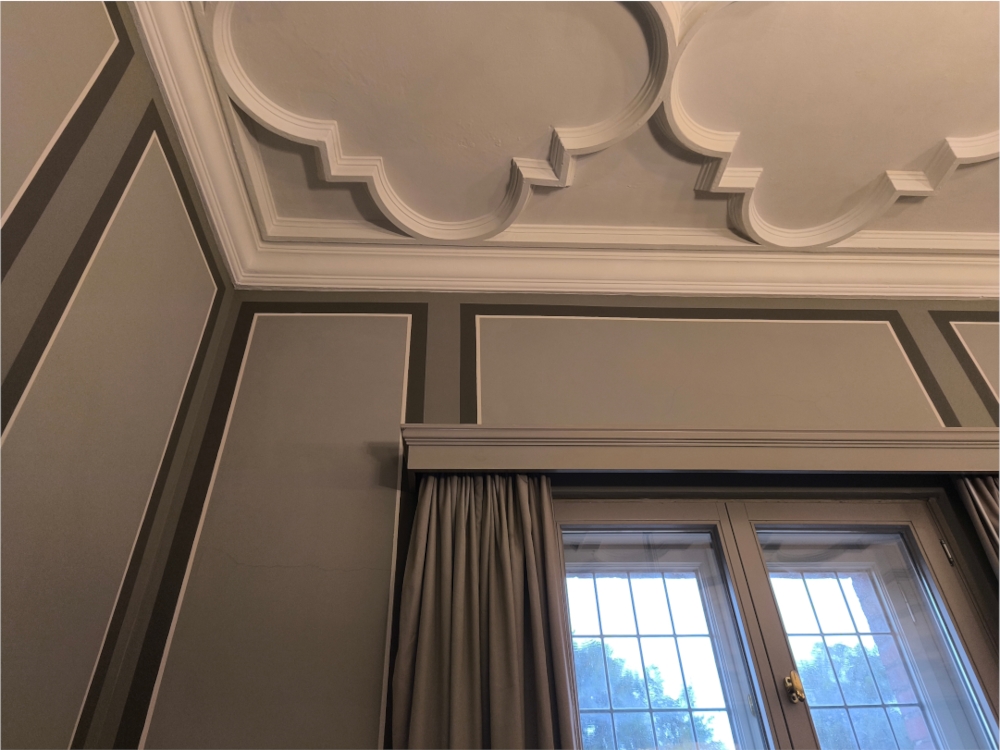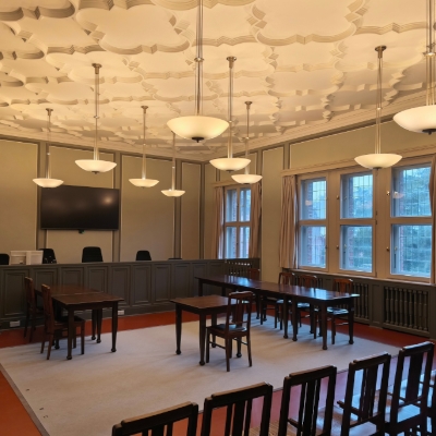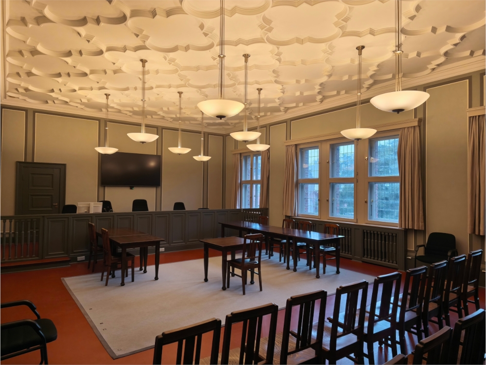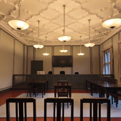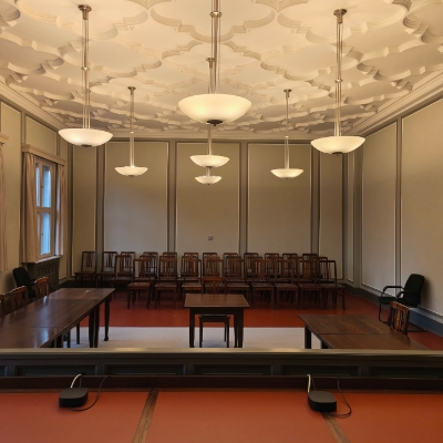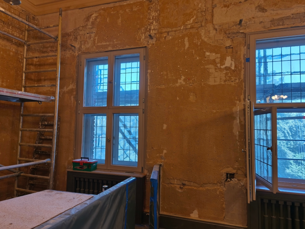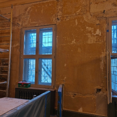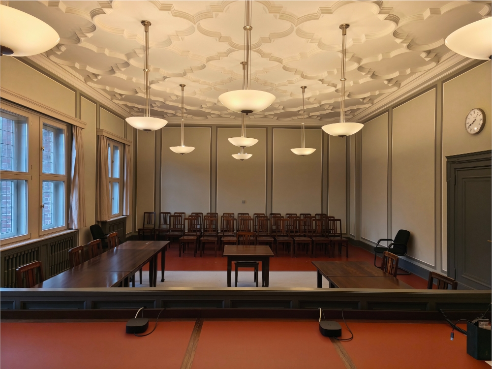 April-Juli 2025: Restaurierung Gerichtssaal 200 mit Putz- u. Malerarbeiten, Gesimsabdeckung Kupfer, Wartung und Instandhaltung Fenster des Giebelportals,