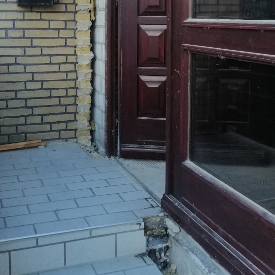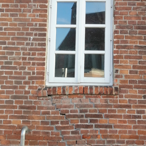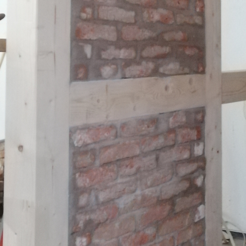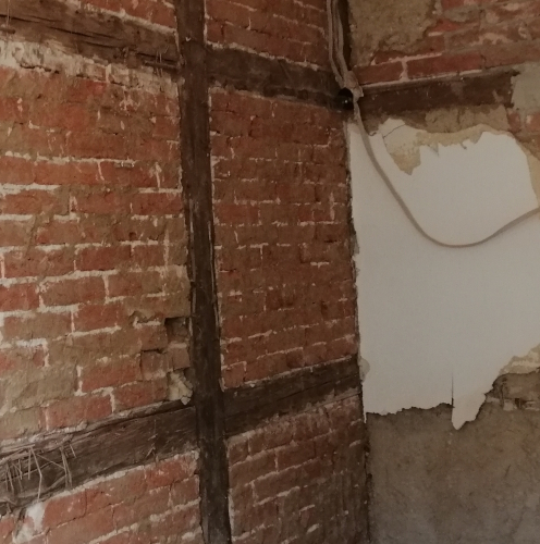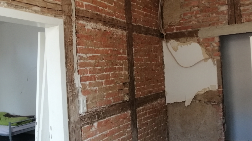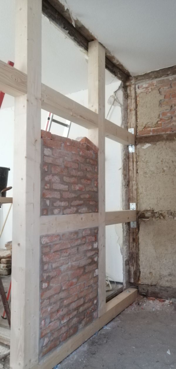 Fundamentunterfangung in Einzelabschnitten an Aussenwand und Innenwand Sanierung einer Fachwerkwand mit Wiederverwendung der Rotsteine und späterem Lehmputz.